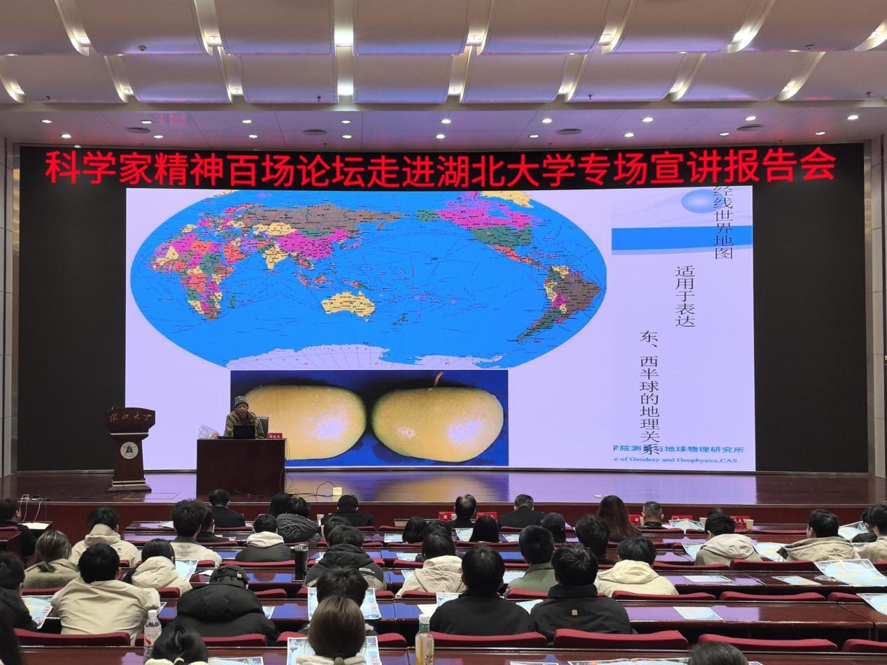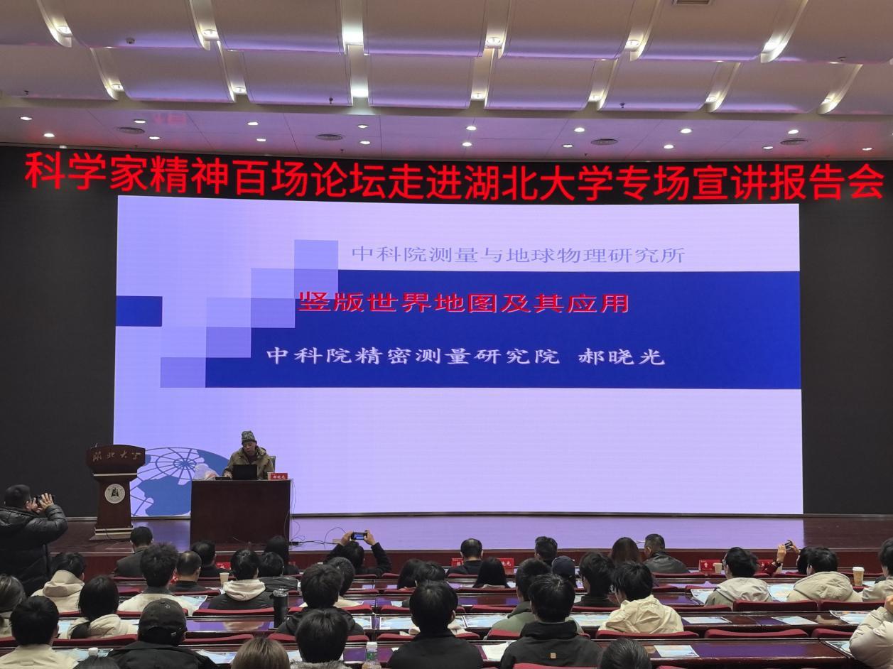 3月18日,湖北大學(xué)會議中心思睿廳內(nèi)座無虛席,“科學(xué)家精神百場講壇”在此舉行。中國科學(xué)院精密測量科學(xué)與技術(shù)創(chuàng)新研究院研究員郝曉光帶來一場題為《豎版世界地圖——換個角度看世界》的精彩報告,用一個“豎起來”的地球視角,顛覆了現(xiàn)場師生的地理認(rèn)知,開闊了視野。